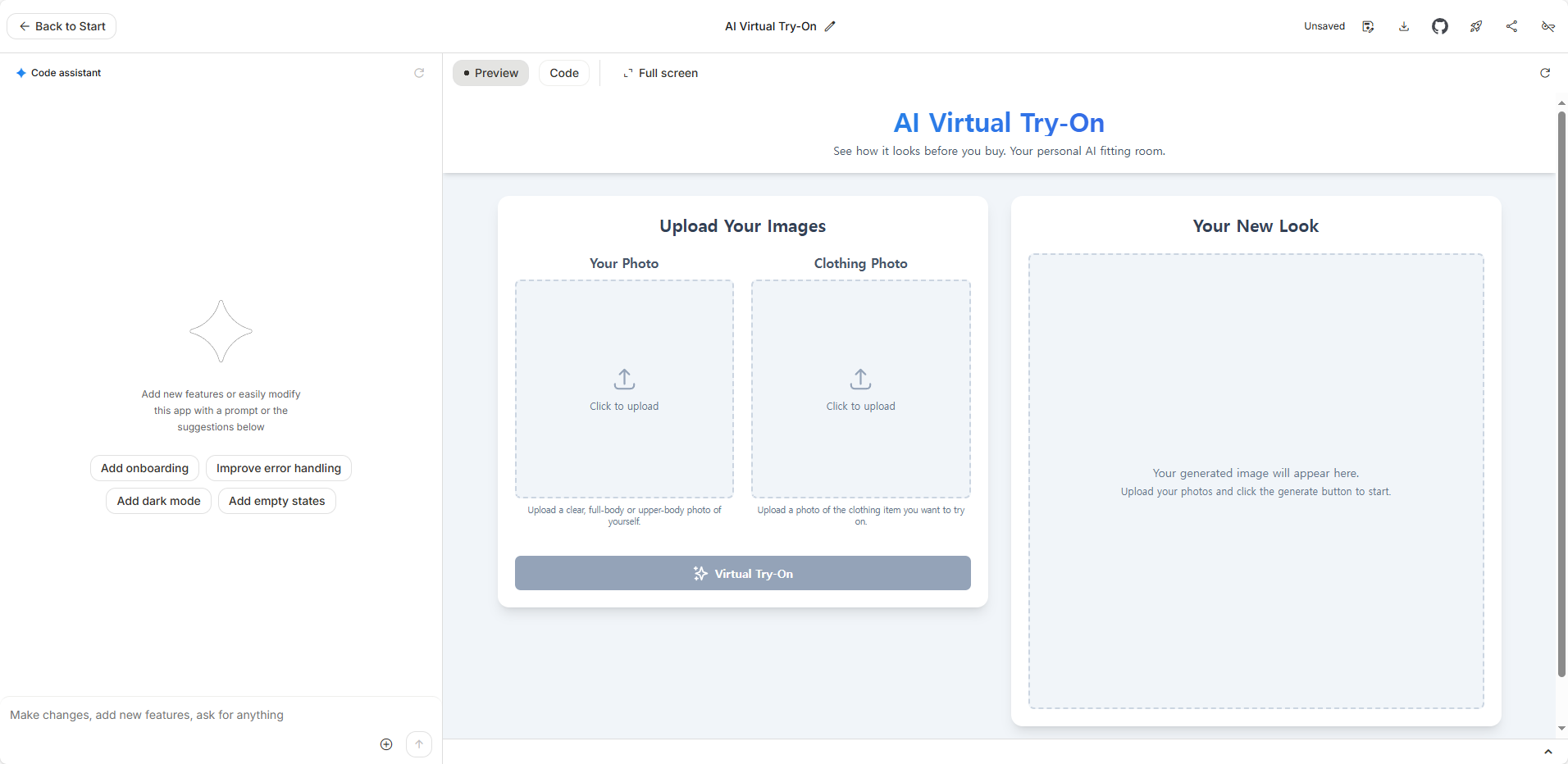 앱 생성 화면 우측 상단을 보면 [Unsaved ▼] 버튼이 있습니다. 이걸 클릭하고 앱의 이름(예: My Virtual Try-On)을 입력한 뒤 저장하세요. 그 후 바로 옆에 있는 공유(Share) 아이콘을 누르면 '일반 액세스 권한이 있는 링크'를 만들 수 있습니다. 이 링크를 복사해서 북마크해두면, 언제든지 나만의 AI 가상 피팅 앱에 접속해서 사용할 수 있습니다!