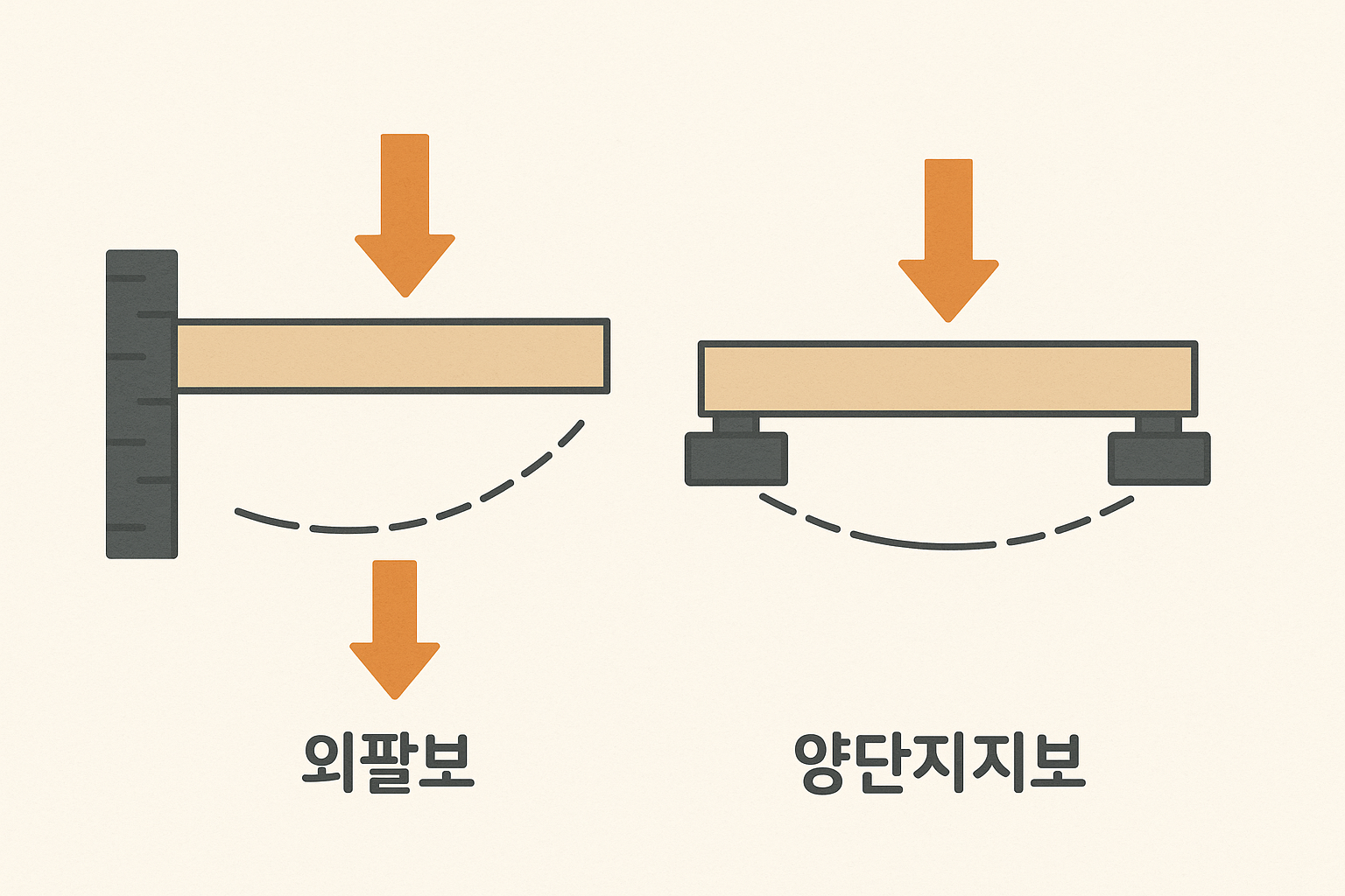 - 양단 지지보의 집중하중: 양쪽 끝이 단순 지지되고 중앙 또는 특정 지점에 하중이 작용하는 경우