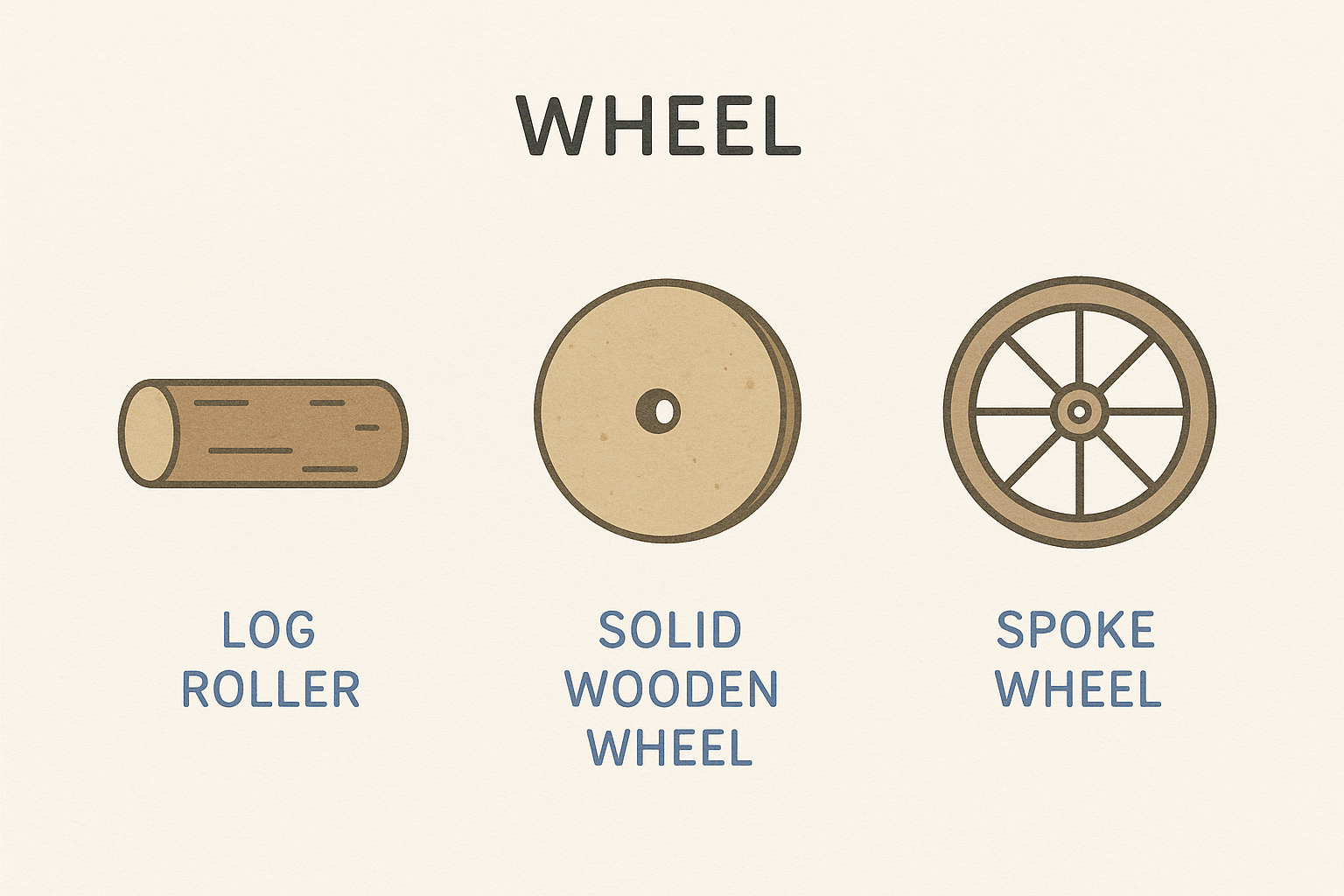 시간이 흐르면서 더 성능이 좋은 디자인이 선호되었고, 새로운 굴림대는 이 최고의 성능을 내는 형태를 모방하여 만들어졌습니다. 그 결과, 굴림대의 중앙은 점점 더 가늘어져 마침내 양 끝에 큰 원반이 달린 가느다란 막대만 남게 되었습니다. 이 원시적인 구조가 바로 우리가 '바퀴'라고 부르는 것의 탄생입니다.