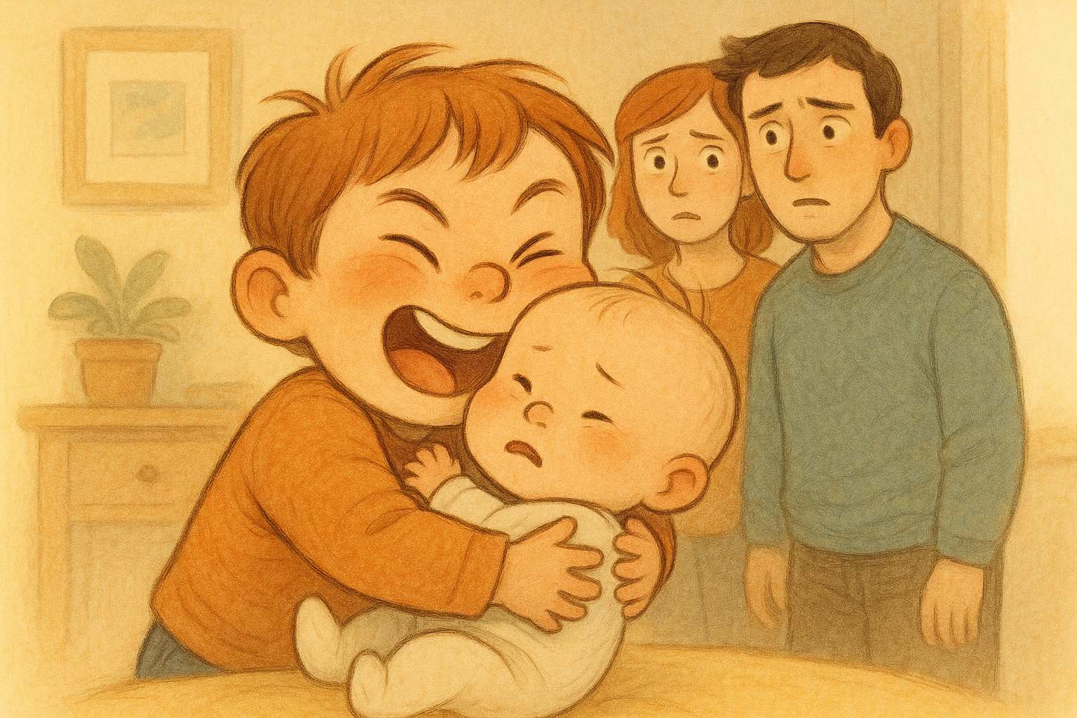 한 아이가 동생을 너무 세게 껴안고 있고, 부모는 그 모습을 걱정스럽다.