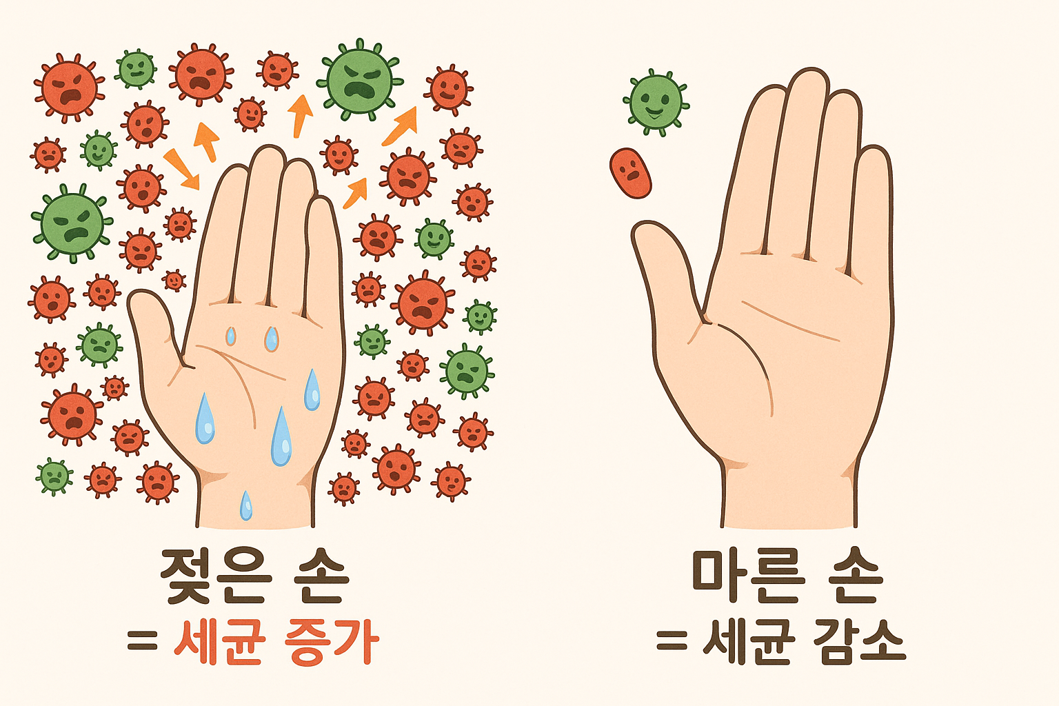 여기서 깜짝 퀴즈 하나 내볼게요! "아예 안 씻은 손"과 "씻고 나서 물기가 채 마르지 않은 젖은 손" 중에 어떤 손이 더 비위생적일까요? 정답은... 놀랍게도 "젖은 손"입니다!