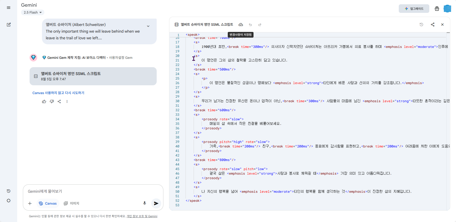 Gemini가 제가 원하는 대로 SSML을 만들어주지 않아요.